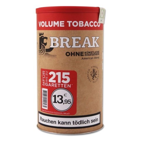 Break ohne künstliche Zusatzstoffe ist ein American Blend Zigarettentabak eine Mischung aus Virginia-, Burleyund Orient-Tabaken. Break ohne künstliche Zusatzstoffe ist ein Volumentabak und zum Stopfen von Zigaretten optimiert. Durch die schonende Verarbeitung behält die Mischung ihre optimale Feuchtigkeit und lässt sich leicht stopfen.