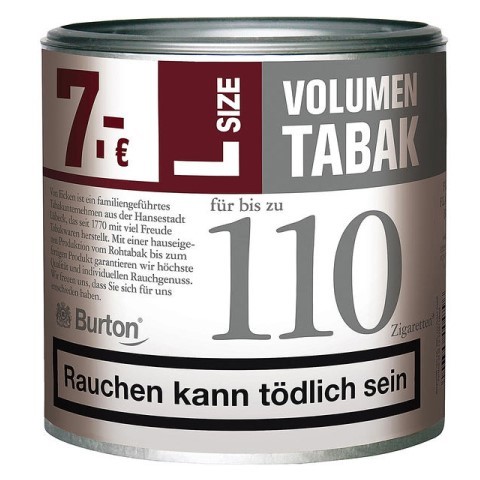Burton Volumen Fine Flavor L ist ein Volumentabak, der sich besonders gut zum stopfen von Zigaretten eignet. Für diesen außergewöhnlich geschmackvollen Tabak werden nur ausgewählte Burley, Virginia und Orient Tabake verwendet, welche bei gleichbleibend hoher Markenqualität und erstklassigem Geschmackserlebnis durch ein besonderes Herstellungsverfahren noch ergiebiger sind. Laut Herstellerangaben können mit einer Dose Burton Volumentabak bis zu 100 Zigaretten gefertigt werden.